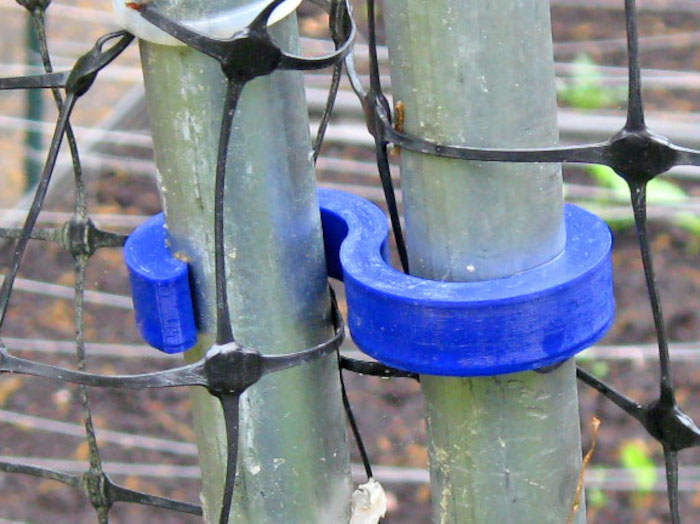 We have plastic deer fencing around our small vegetable garden, attached to posts made of 1" steel conduit. I designed this S-shape latch to hold the "gate" post next to the "fence" post. The latch is flexible enough to let one post slip out when we want to open the gate.